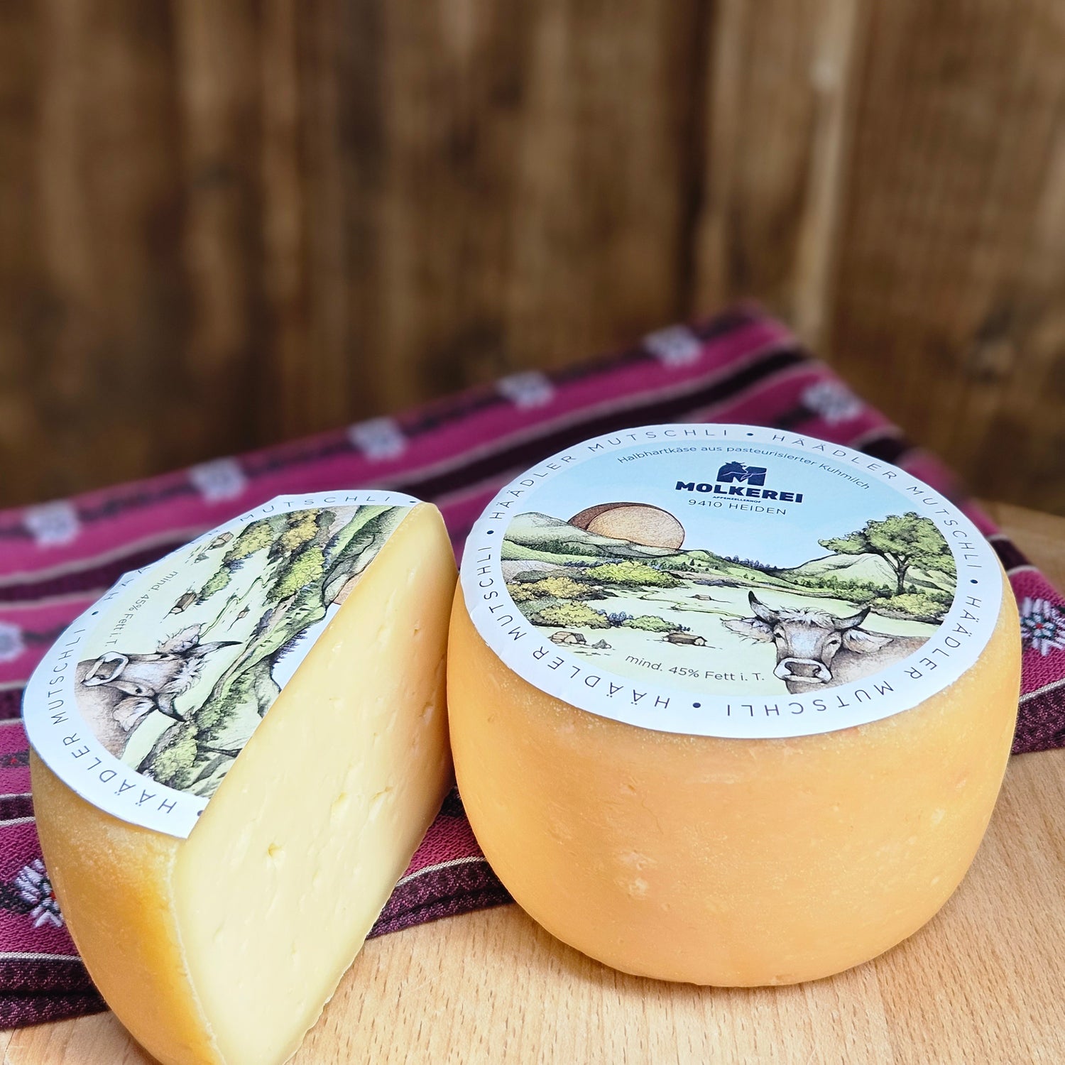 Mit Herzblut wird unser Mutschli aus pasteurisierter Kuhmilch hergestellt. Mutschli-Laibe wiegen um die 500 Gramm. Den feinen Halbhartkäse gibt es in den Varianten Nature, Kräuter, Chili oder Knoblauch.