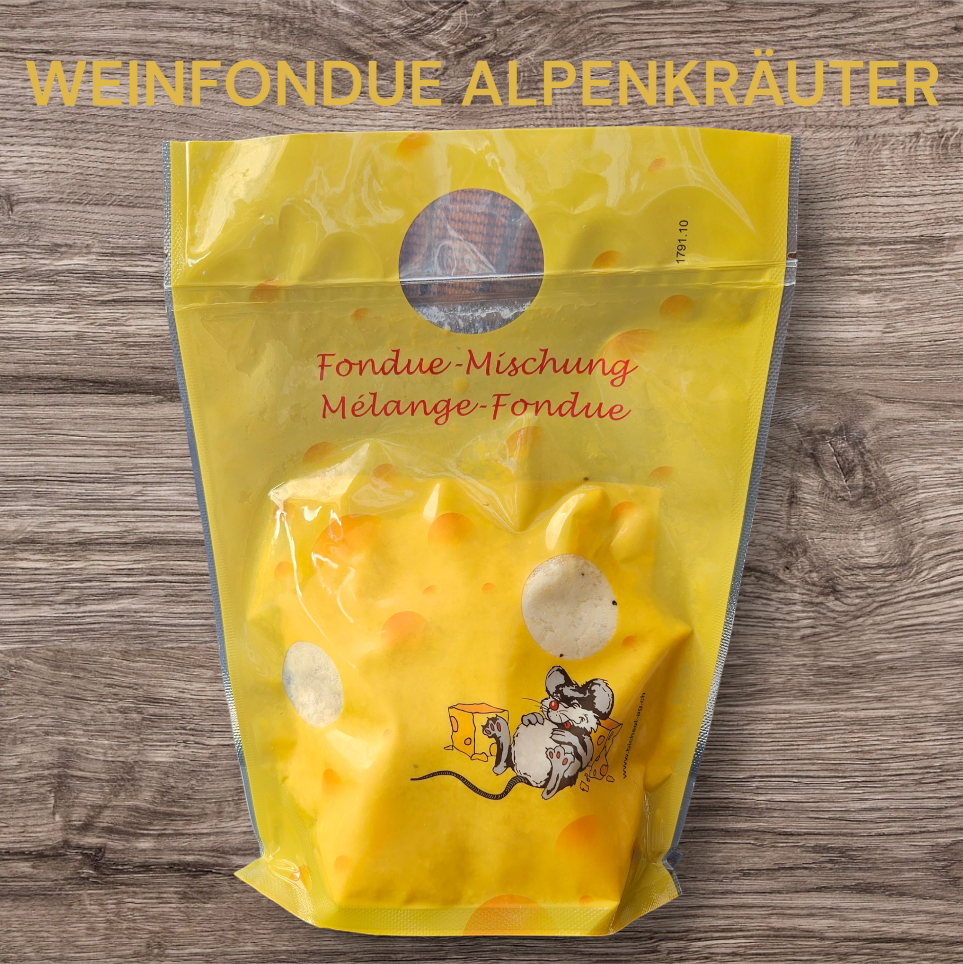 Käse, Wein, Stärkemehl, Alpenkräuter, Gewürz: (Pfeffer schwarz, Paprika, Knoblauch, Muskat, Cayenne-Pfeffer)